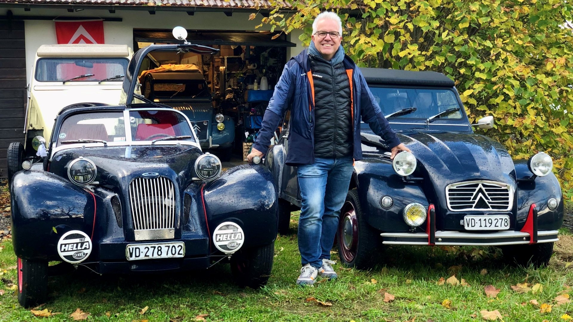 Un vieux hangar perdu dans les hauts de Saint-Légier. Deux petits garages remplis de pièces détachées, où flotte un parfum de mécanique ancienne. Et parquées devant, cinq ou six voitures estampillées de l’emblématique double V renversé. C’est donc ici, au milieu des prés et des vaches, que David Ferrari a édifié son temple consacré à la 2CV, la «Deuche» pour les intimes. «Quand je viens ici, je mets les mains dans le cambouis et ça me permet de sortir de mon travail, de mes papiers», glisse tout sourire le directeur du Bureau technique intercommunal du Cercle de Corsier.