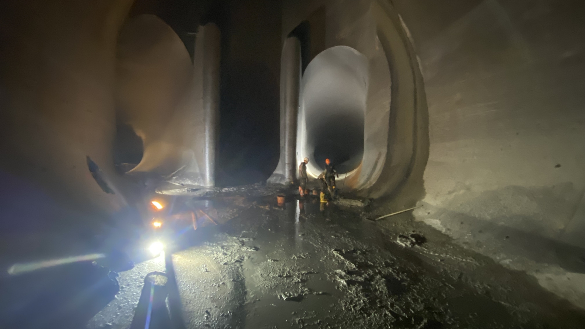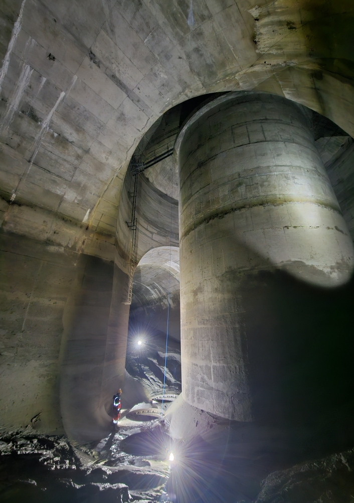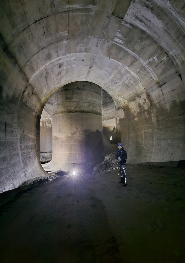 Dans cette gigantesque cathédrale de béton, habituellement noyée sous les eaux furieuses, on reste fascinés. L’ambiance est onirique, mais aussi un peu anxiogène. Le bruit sourd des génératrices diesel d’éclairage et de ventilation y contribue, tout comme le fait d’être privés de nos habituels repères visuels.