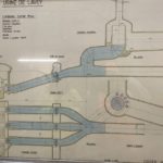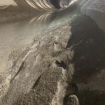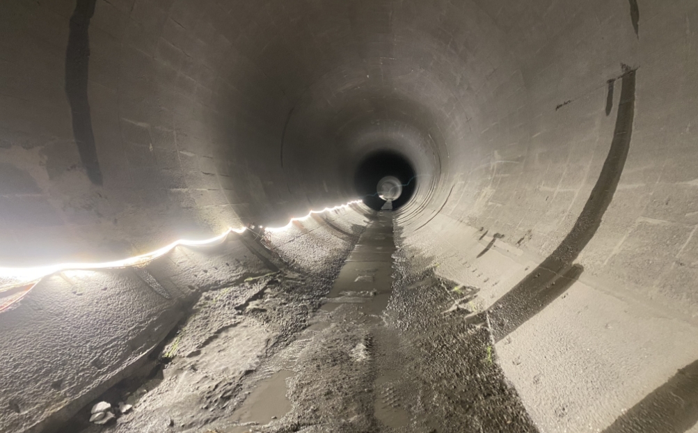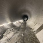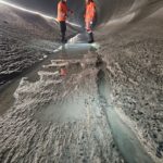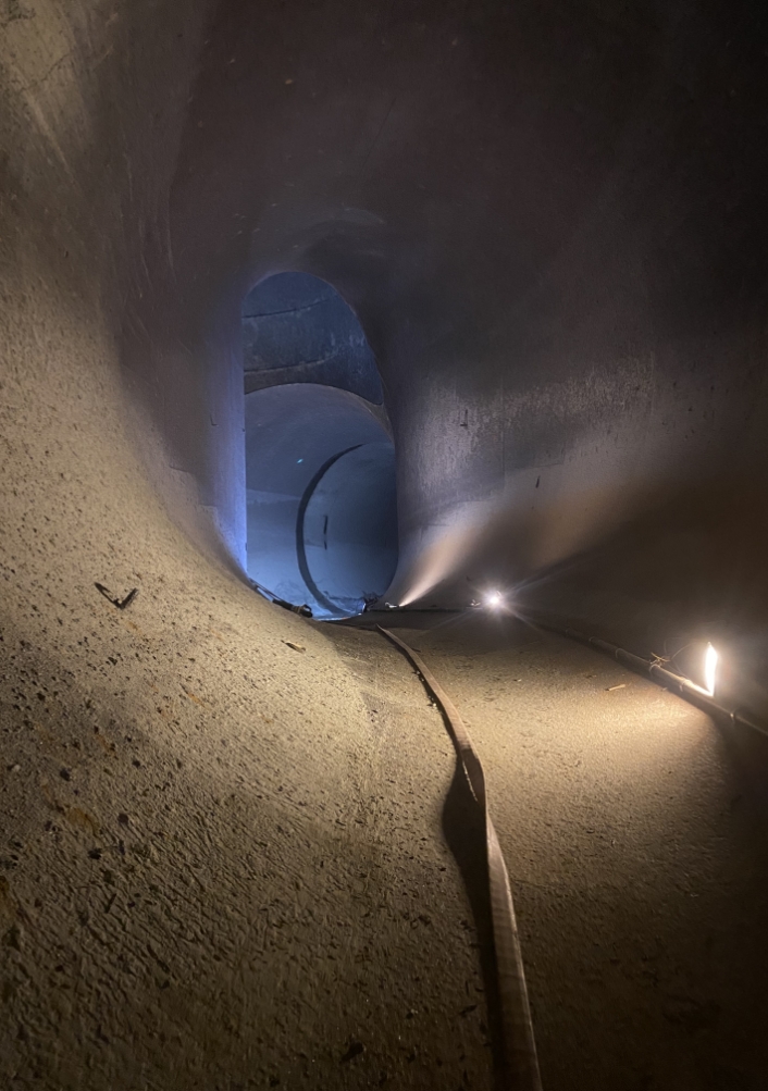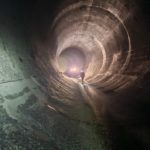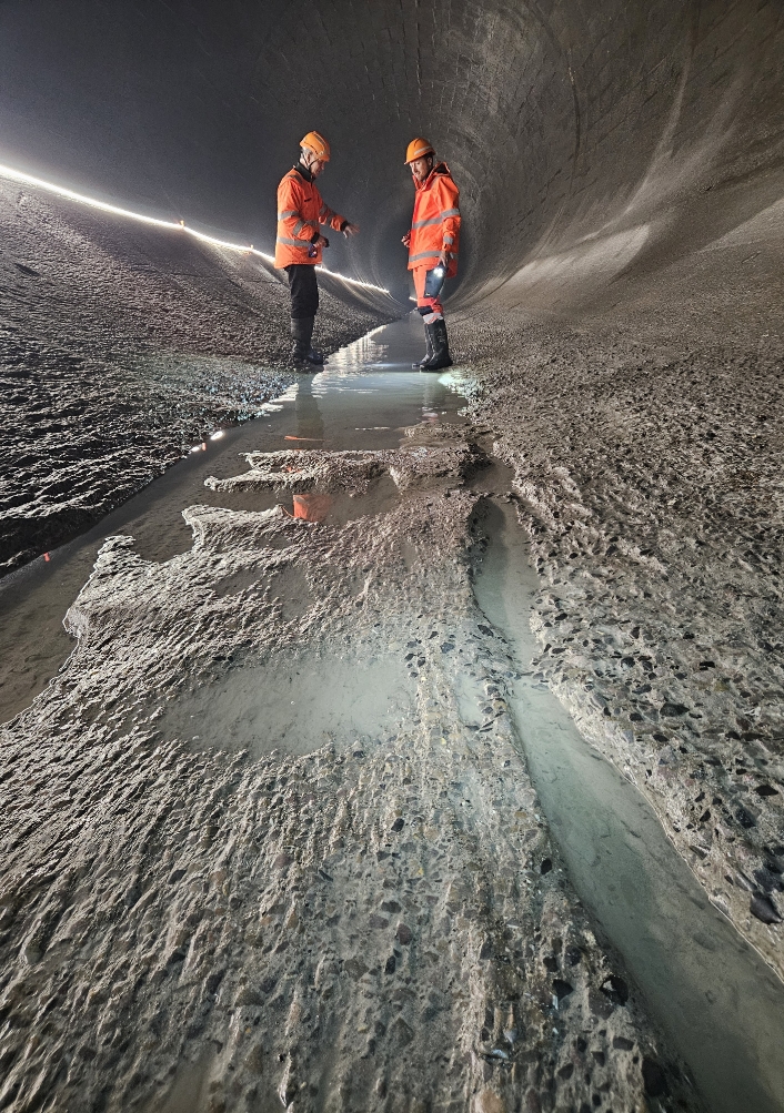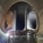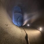 Durant tout le temps des travaux, le débit du Rhône a été notablement plus élevé entre Evionnaz et Lavey. Les promeneurs l’auront remarqué. Le fleuve flirte avec les 150 m³/s contre seulement 2 m³/s habituellement à cette période. Une fois les trois turbines de 3m70 de diamètre passées, nous entrons dans la conduite via un trou d’homme de 45 cm de diamètre. Claustrophobes s’abstenir! De là, nous rallions rapidement l’entrée de la chambre d’équilibre, une zone importante où les changements de débit soudains peuvent être encaissés sans dommage. Trois ouvriers s’activent encore sur place, pelles à la main.