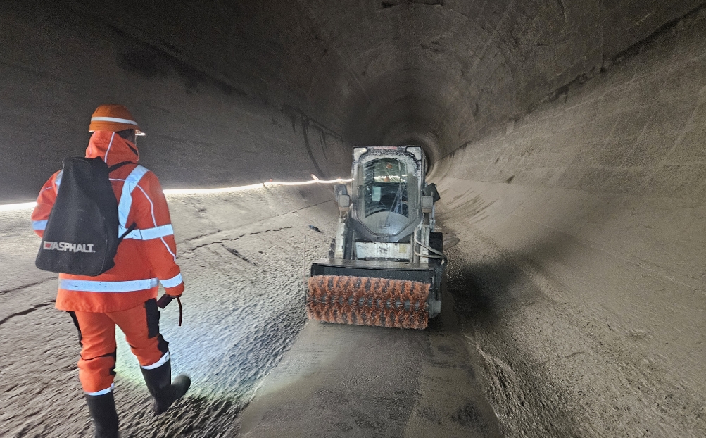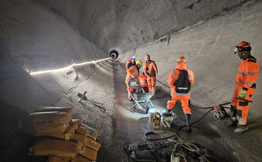 Ces travaux de rénovation d’un coût de près de 2 millions de francs ont été réalisés par une vingtaine de professionnels du consortium JPF Dénériaz. Ces derniers ont d’abord dû éclairer toute la galerie – norme de sécurité de la Suva oblige – avant de la nettoyer pour y couler au sol un total de 550 m³ de béton sur 1m60 de large au sol.