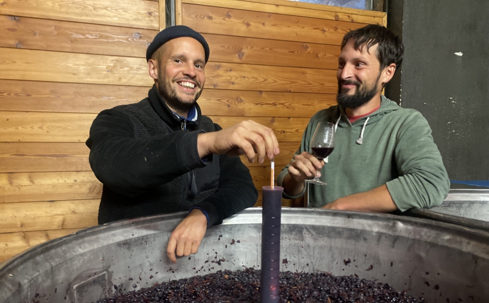 Dans le cellier, les cuves ne sont pas dernier cri, même si la pluie du jour arrose des tonneaux flambant neufs. Mais les Favre tiennent à leur statut de «petite cave». «On est des adeptes du système D quand il le faut, comme avec le recours à la fermentation à froid, reprend Gilles. De toute façon, le 99,9% du résultat final dépend de la qualité de la récolte. Bien sûr, avec le 0,1% restant, tu peux faire un grand vin ou tout louper, mais il faut avant tout un bon raisin.»