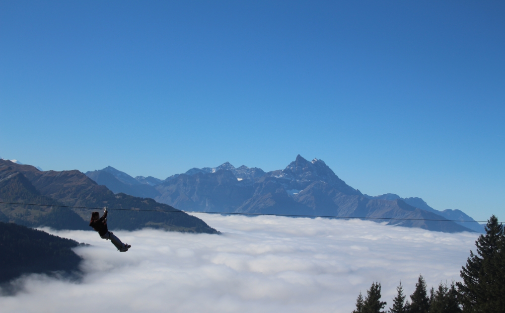 Survoler les Alpes vaudoises sur 700 mètres, c’est l’expérience que propose Alpine Zipline. Deux tyroliennes reliées entre elles «pour faire le plein d’adrénaline tout en profitant d’un panorama grandiose». Située à 100 mètres de l’arrivée de la télécabine des Chaux, l’attraction touristique a été mise sur pied cet automne par Parc Aventure SA et ouverte pendant les vacances d’octobre.