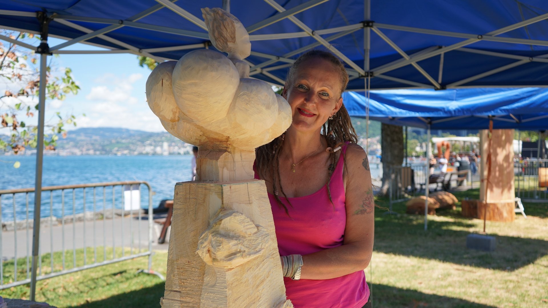 Les tronçonneuses vrombissent, les copeaux tourbillonnent, et l’odeur du bois fraîchement taillé flotte dans l’air ce jeudi au bord du lac à Villeneuve. À l’approche de l’heure du dîner, les quais sont encore peu fréquentés, mais animés, grâce à la quatrième Biennale de sculpture sur bois. Depuis lundi, les rives du bout du Léman se sont transformées en atelier à ciel ouvert. «C’est très rare d’avoir des créations <live> avec des sculpteurs qui partagent leur processus artistique directement avec le public», s’enthousiasme Marie-Hélène Heusghem, vice-présidente de l’Association Villeneuve Culture, qui organise la manifestation.