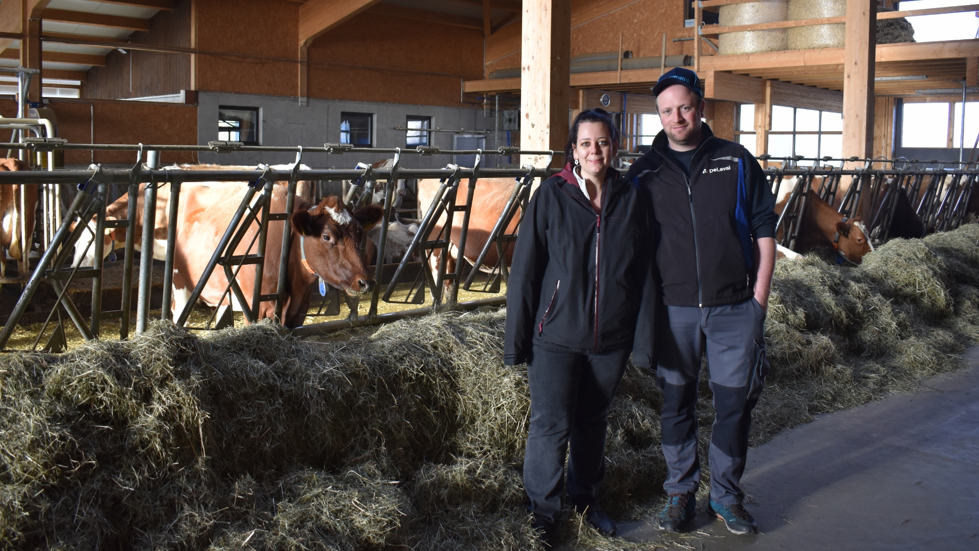 Jacques et Aurélie Perroud dans le bâtiment inauguré en 2020, à côté de leur vache Venise. | V. Schmidhauser