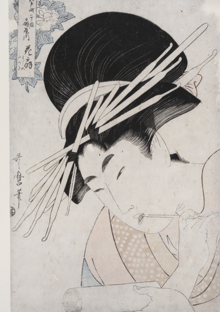 Légende: L’ensemble d’Oskar Kokoschka est constitué de gravures de grands maîtres du tournant du XVIIIe et XIXe siècle, avec un accent particulier sur Utamaro. Ici une de ses estampes, «Courtisane avec rouleau illustré», vers 1800. | Musée Jenisch Vevey